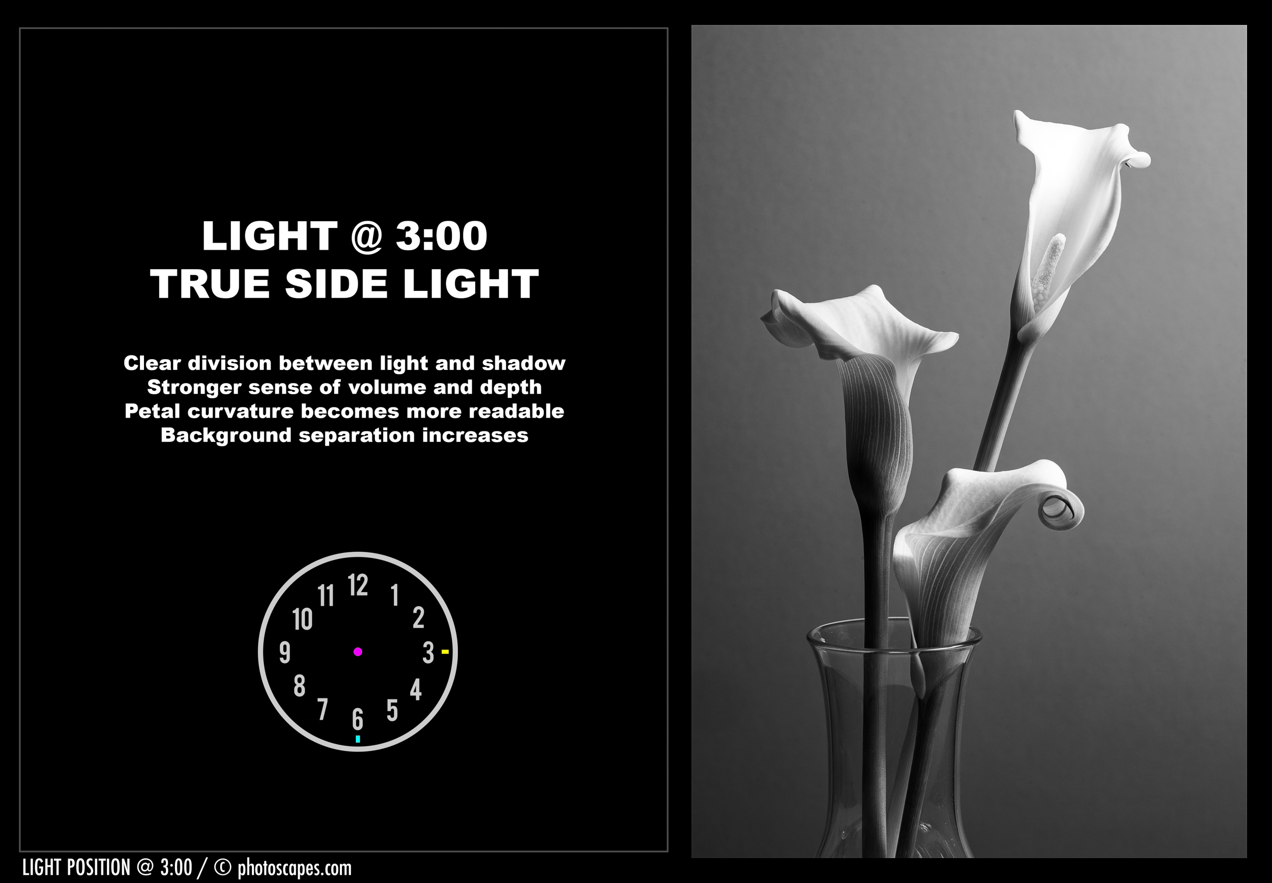 In the sequence of images above, the light was moved to various positions in relation to the flowers. Rather than getting into angle measurements, I prefer to describe the light’s position using the face of an analog clock—a simple, intuitive reference most of us already understand.