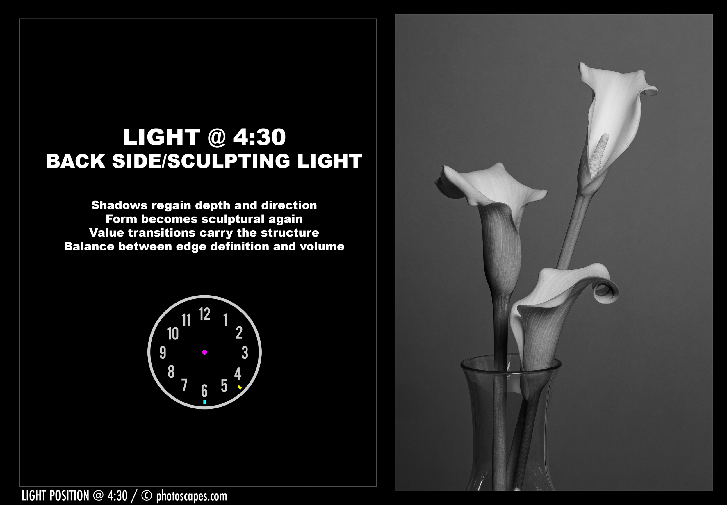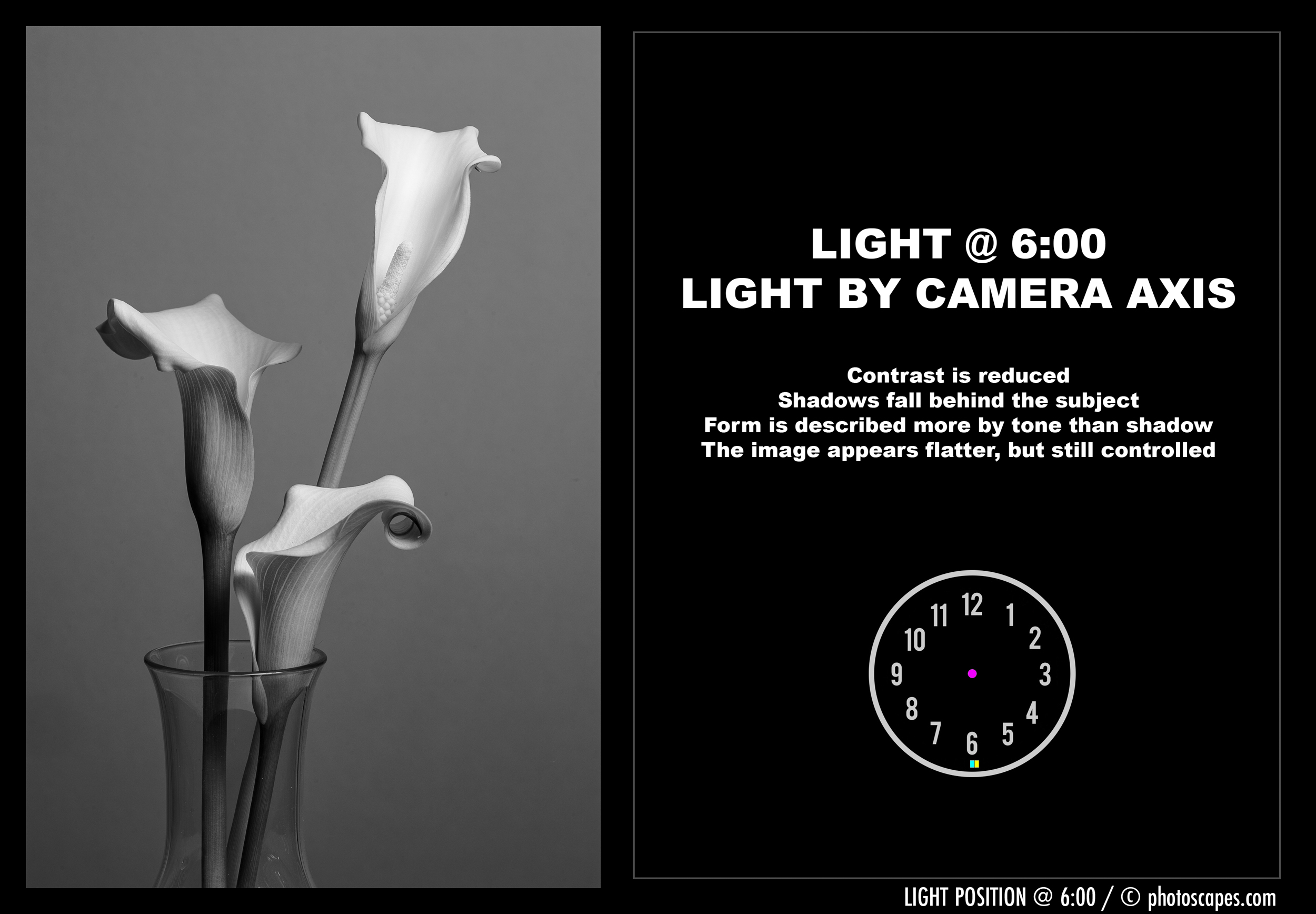 Below is the sequence of images in black and white. The clock positions show where the light is placed around the subject, which remains centered, while the camera stays fixed at approximately six o’clock.