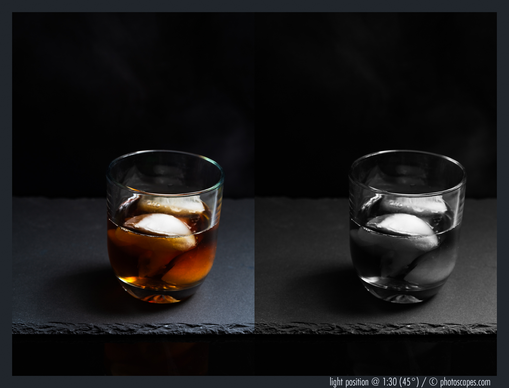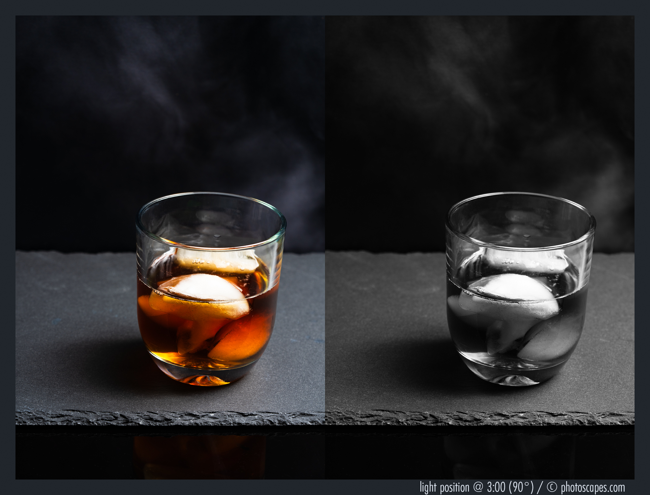 As the light moves to the side, the glass begins to flatten. The rim highlight shifts, interior contrast compresses, and the sense of depth is reduced.