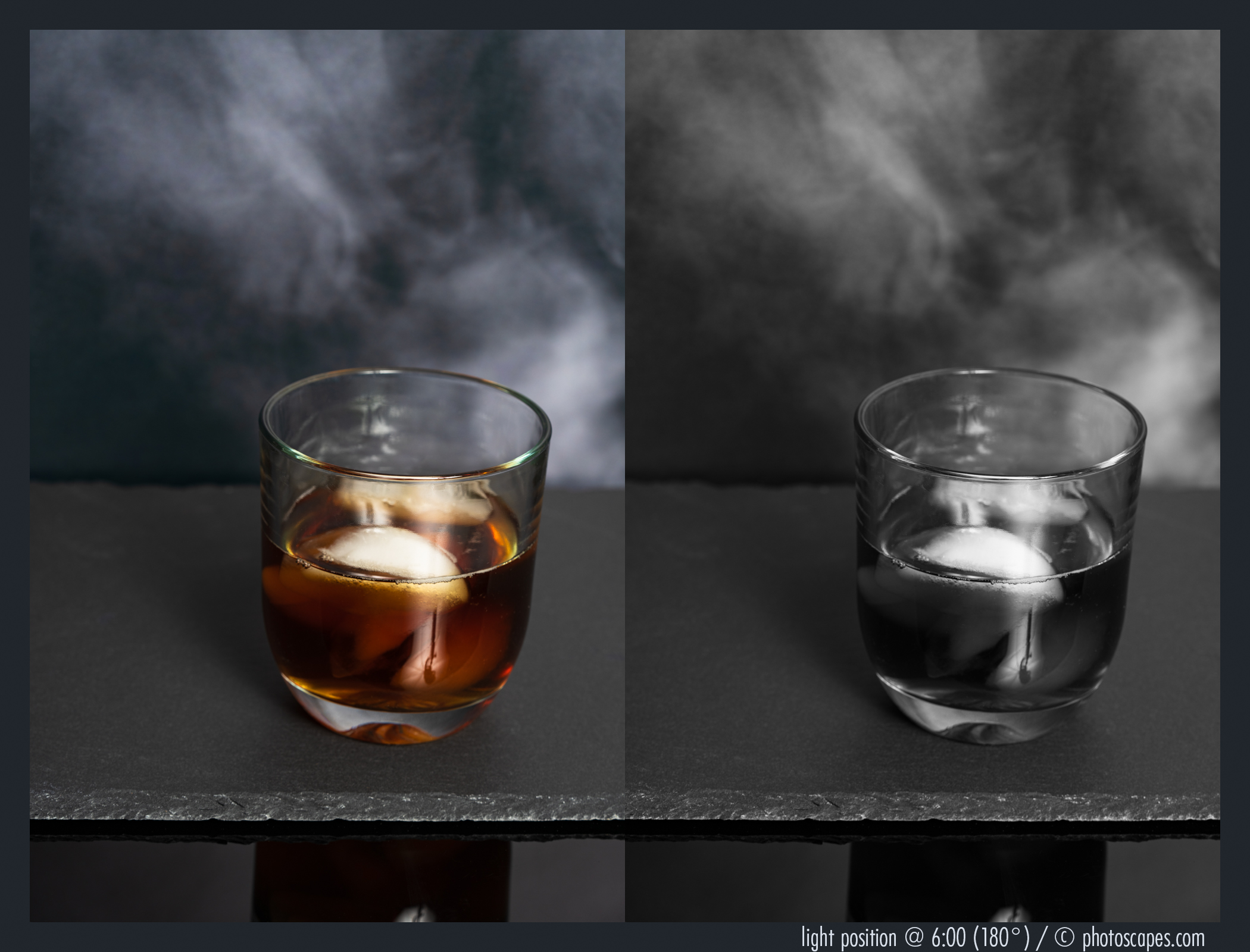 With the light placed directly next to the camera lens, the glass loses much of its shape. Reflections of the strobe and light stand become visible on both the glass and the black plexiglass. The light floods the scene rather than describing it, and the still life becomes flatter, with little separation or depth. This is an important light position, and one we’ll talk more about next.