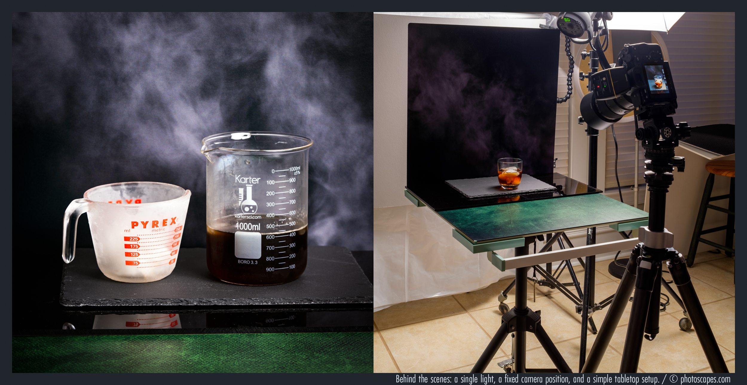 I mixed black tea with a small amount of coffee to stand in for the liquid in the glass, simply because I don’t keep soft drinks or liquor on hand. One of the things I enjoyed most during my commercial photography training was prop building, and I initially thought I would end up in food photography. While my career took a different direction, that training still shows up whenever I’m faced with a still life and an empty cupboard.
