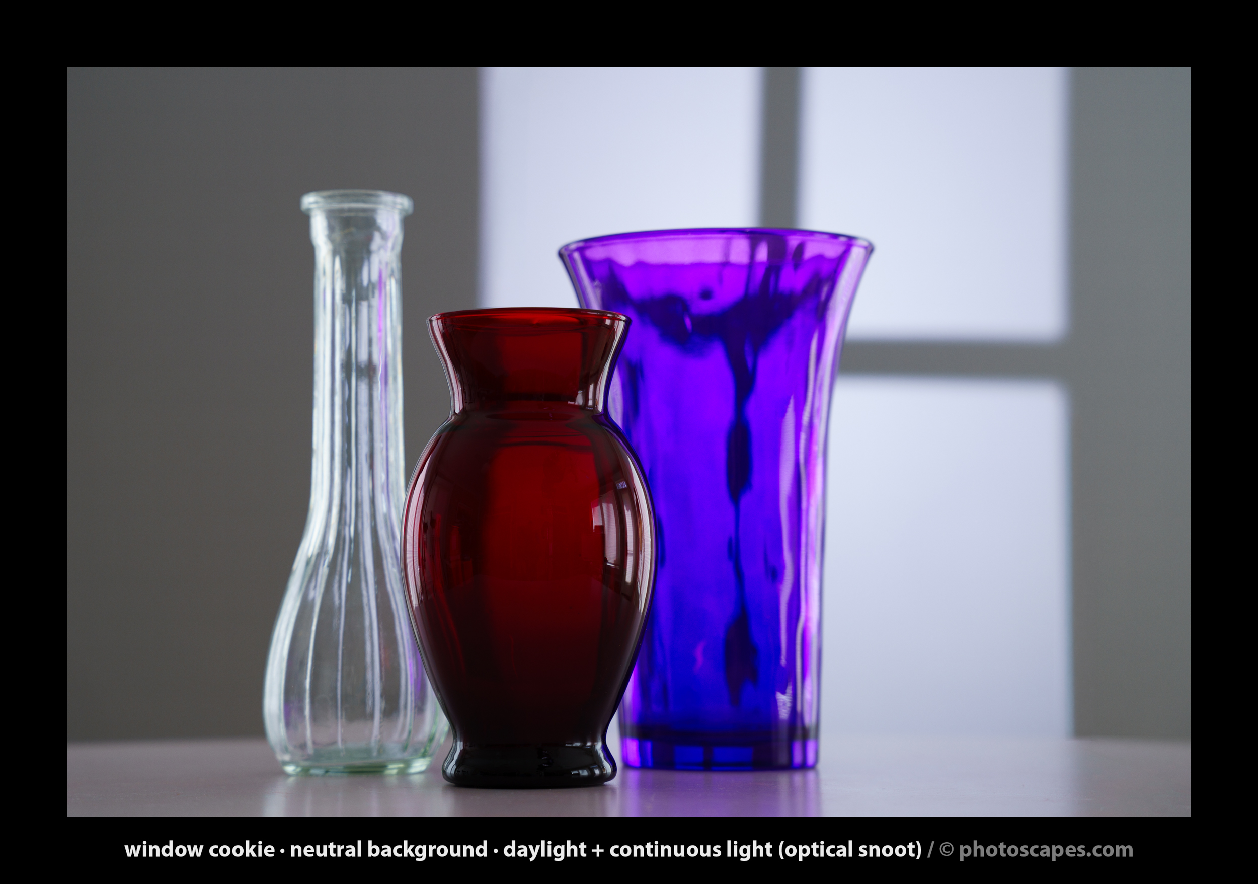 In the first image, the background pattern is created with a cookie placed in the optical snoot. The cookie produces a simple window-like shape, adding structure and a sense of place while keeping the light restrained and quiet. Nothing about the subject lighting is dramatic — the glass remains softly lit, and the background simply suggests an environment rather than describing one outright.