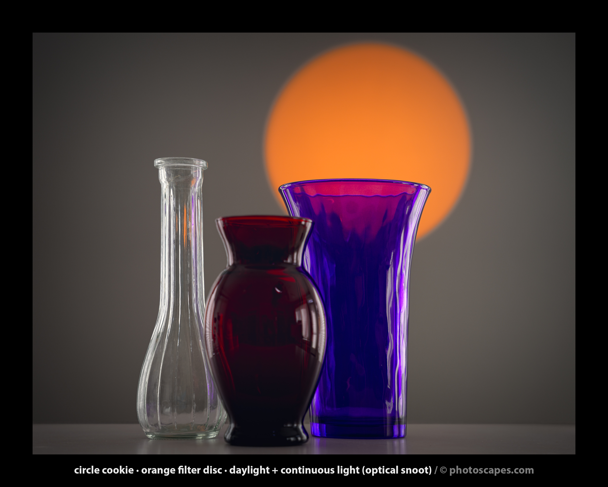In the second image, the cookie is changed to a circle, and an orange filter disc is added to the optical snoot’s filter ring. The result is a clean, graphic shape with color — still simple, still controlled, but now more intentional. The glass objects haven’t moved. The subject lighting hasn’t changed. Only the design of the background light has been adjusted.