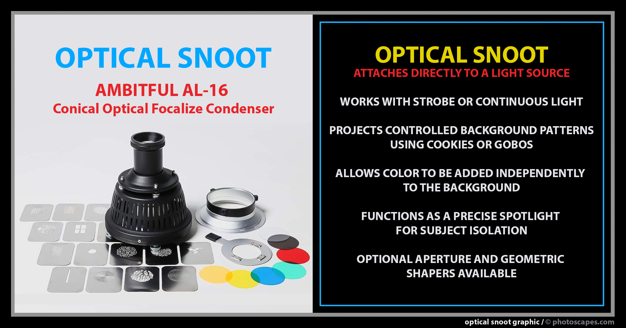Despite the impressive titles, what it does is refreshingly simple and very useful from a design standpoint. An optical snoot can function as a clean, controlled spotlight, or it can project color or a stenciled pattern onto a background. That stencil is often called a cookie (short for cucoloris) or a gobo (“goes before optics,” because photographers love practical names).