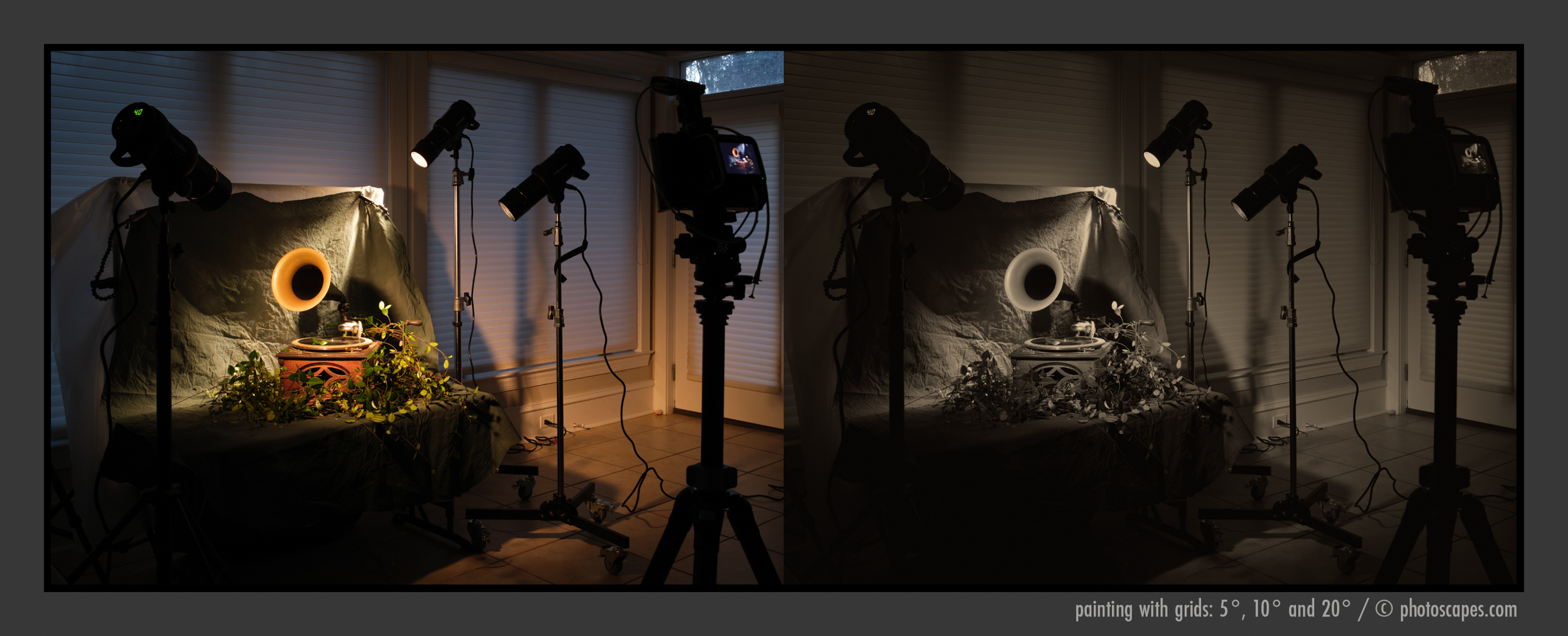 The series of images below demonstrates how different grid angles—20°, 10°, and 5°—change the spread and control of light.