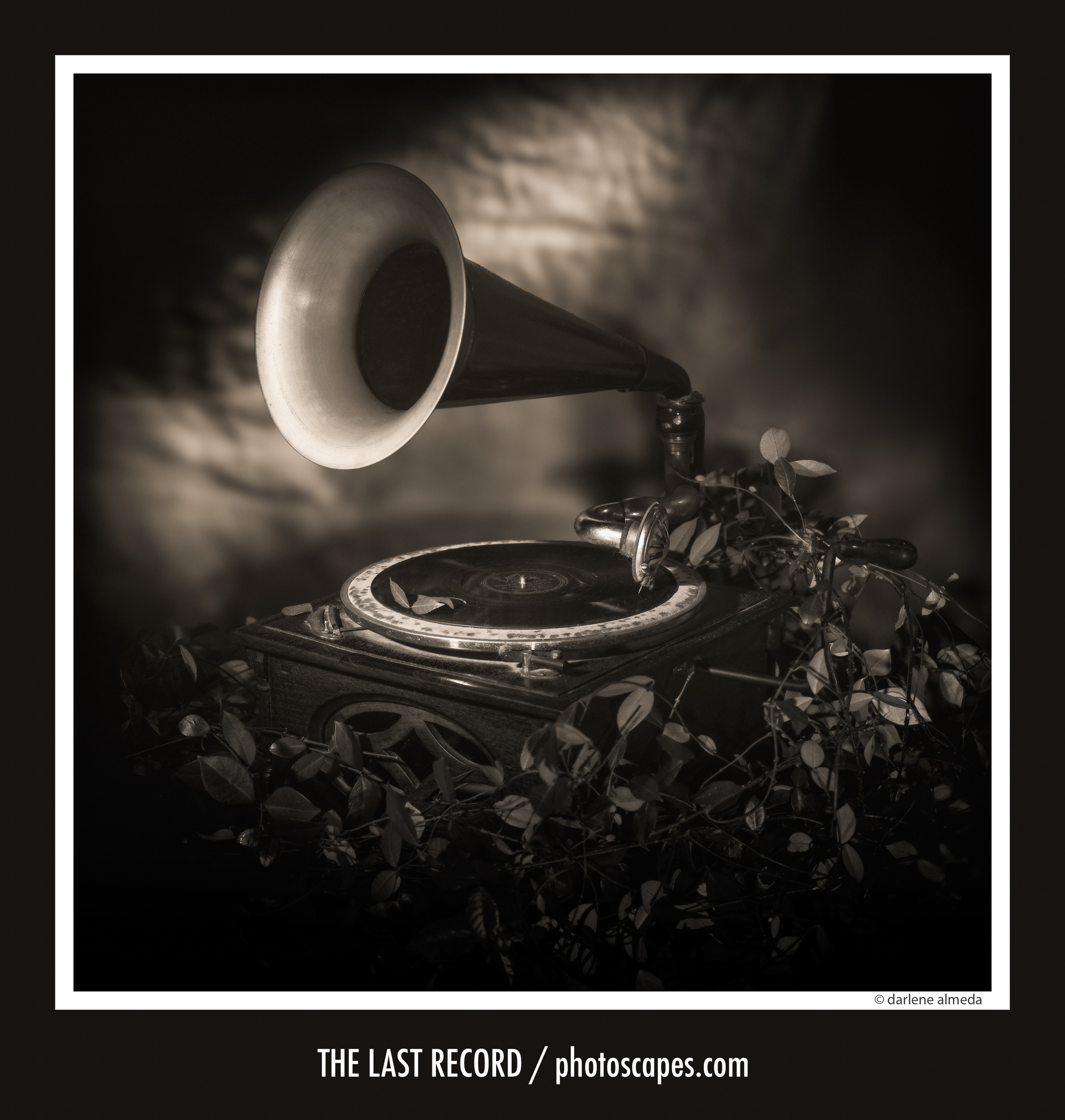 For this example, I chose a prop I have held onto for many years—an old Victrola from that same era. It is easy to imagine an object like this being photographed for an advertisement during its day. The vines are real and came from my backyard fence. Sometimes creativity means going on a small hunt for whatever materials are available. With careful framing, a bit of cropping, and subtle post-processing, the scene can be shaped into something that feels as though it belongs to another time.