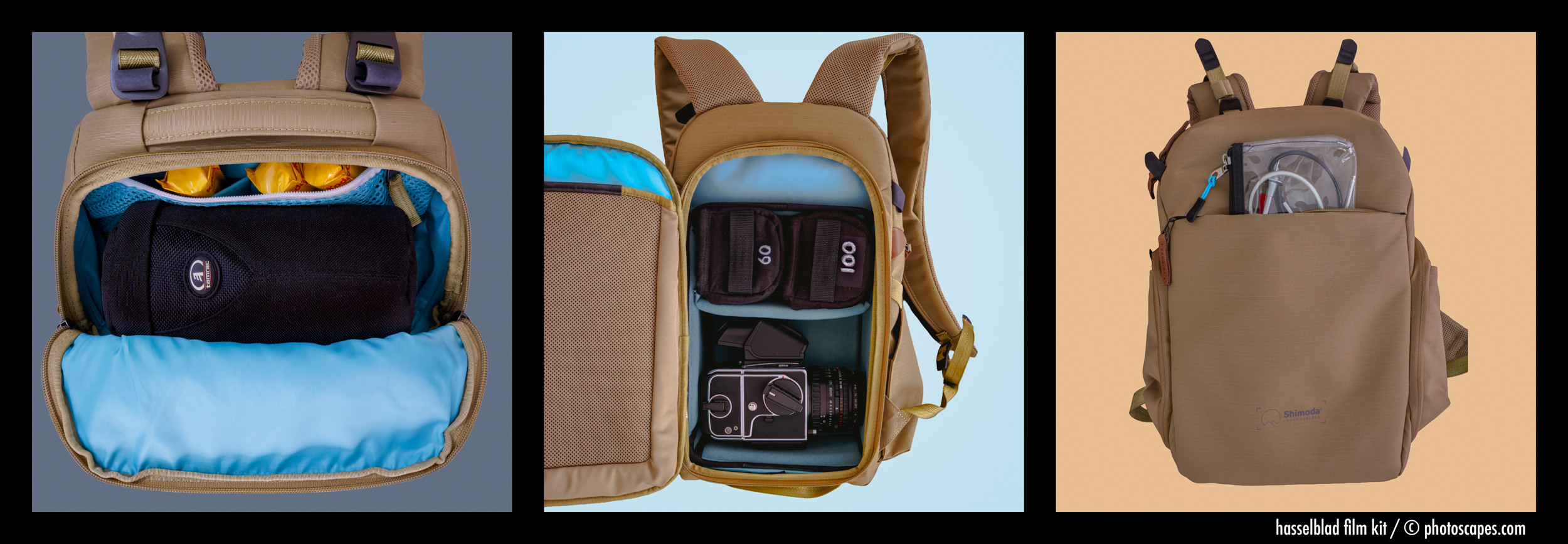 When the Hasselblad gear comes out, that same 20L pack shapeshifts into the Cambo Wide 580 pack: a 4×5 camera, 58mm lens, Fotoman 6×12 viewfinder, Horseman 6×12 film magazine, Minolta light meter, Linhof pocket viewfinder, and a filter case. The Shimoda’s front pocket holds a clear plastic pouch with shutter releases, a hex tool, and cleaning supplies—nothing glamorous, but essential. When I switch to the Alpa STC kit, the contents reshuffle, but the pack stays elegant, organized, and very much under control.