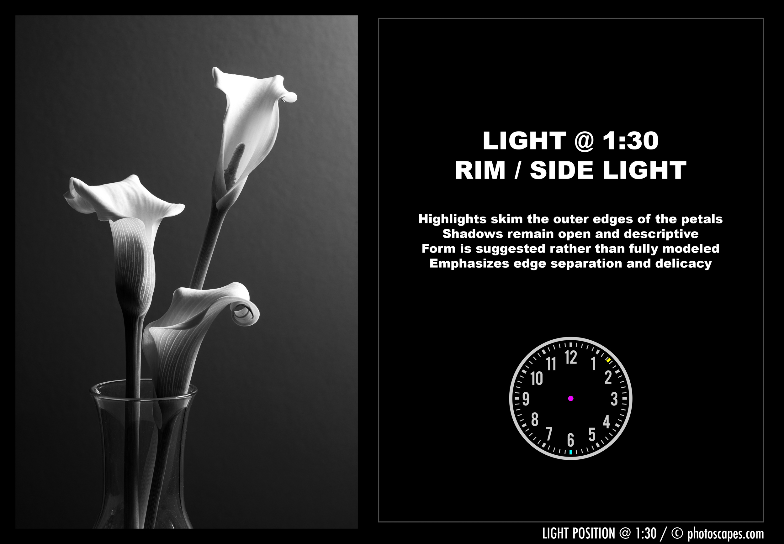 In the sequence of images above, the light was moved to various positions in relation to the flowers. Rather than getting into angle measurements, I prefer to describe the light’s position using the face of an analog clock—a simple, intuitive reference most of us already understand.
