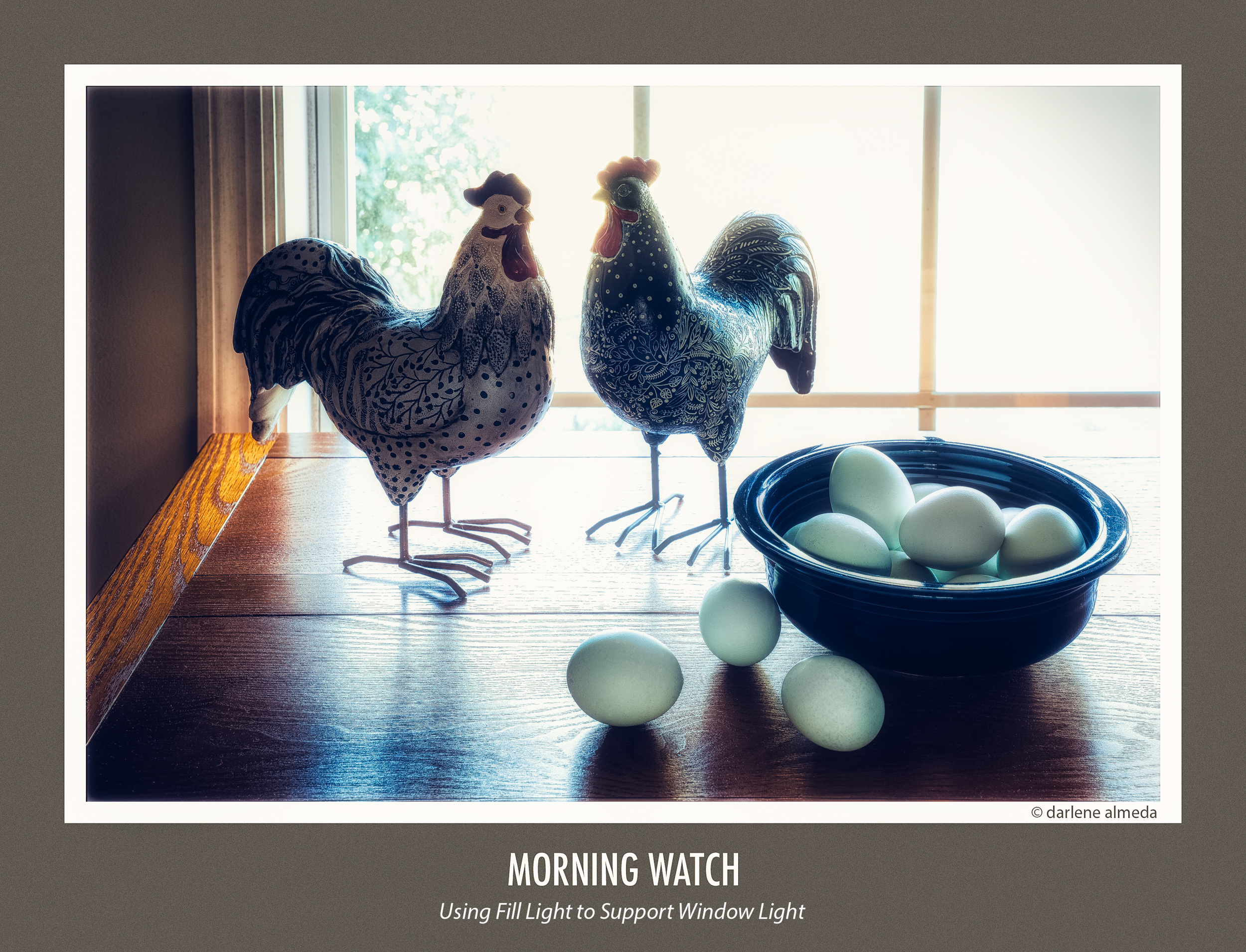 - Window light only: Â Deep shadows, strong mood