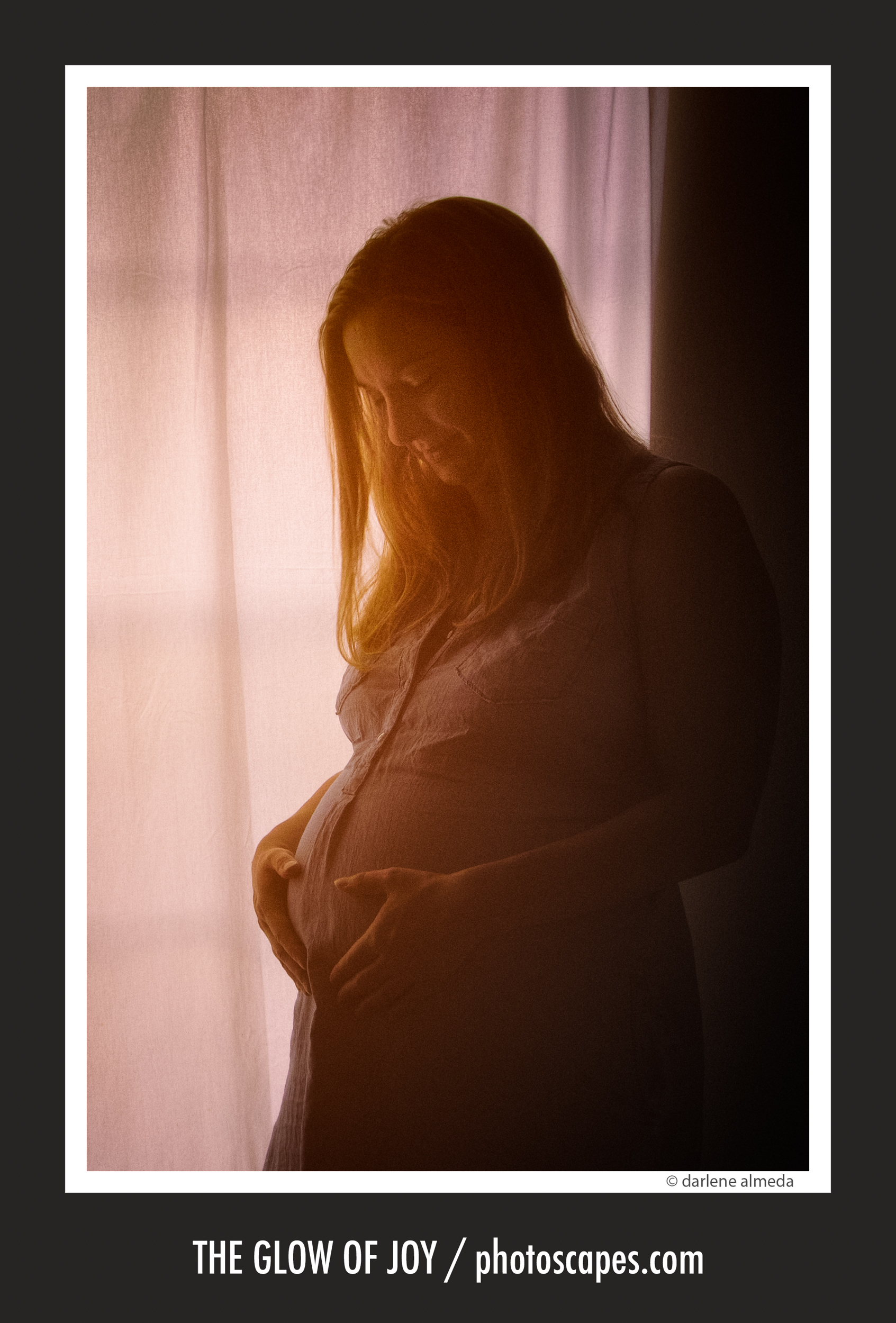 This image was made using window light diffused through a sheer curtain, with a gold reflector held just out of frame to gently return light to the shadow side of the face. The intention was a classic mother-in-waiting portrait.