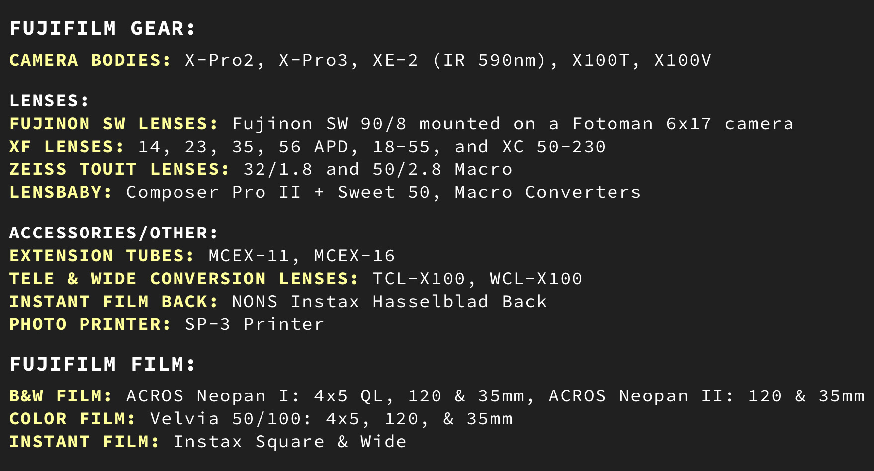Below is a list of Fujifilm cameras, films, and accessories I’ve worked with. If you have questions about my experience with any of these, feel free to reach out.