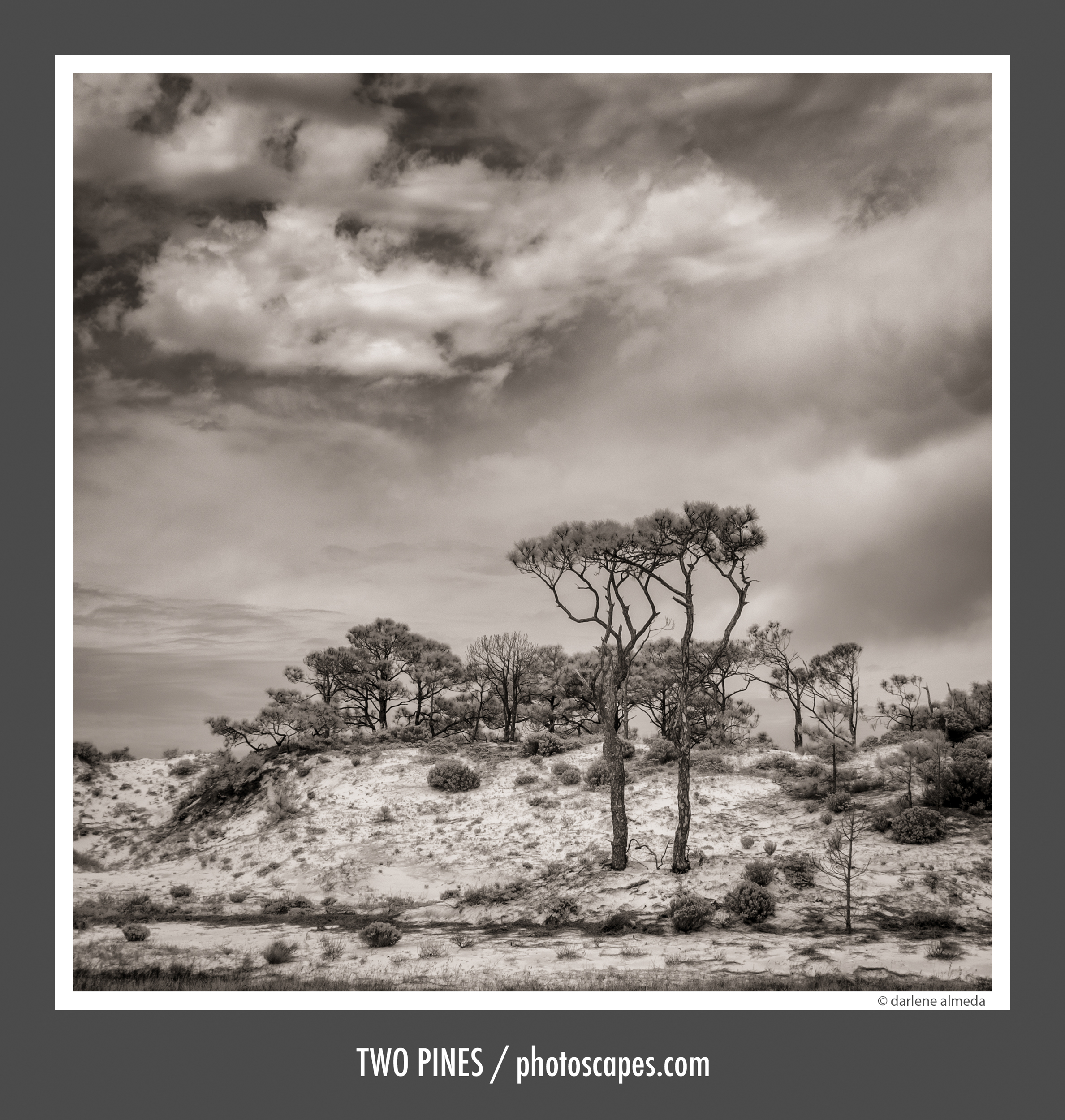 Indeed, all lenses are not created equal, especially when using them for IR photography. Before choosing lenses for your IR photography, here is a list and another list to look at regarding how some lenses behave with an IR sensor. Do testing with your lenses before you strike them out entirely if they are found on a not-recommended list. From my experience, the Zeiss Touit 32/1.8 is on a not-recommended list, but if you look at the middle picture of Two Pines below, it has no visible hot spots and was shot with the Touit 32/1.8. Also, from my experience, zoom lenses do not play well with IR, and all my zooms produce hot spots in my images.