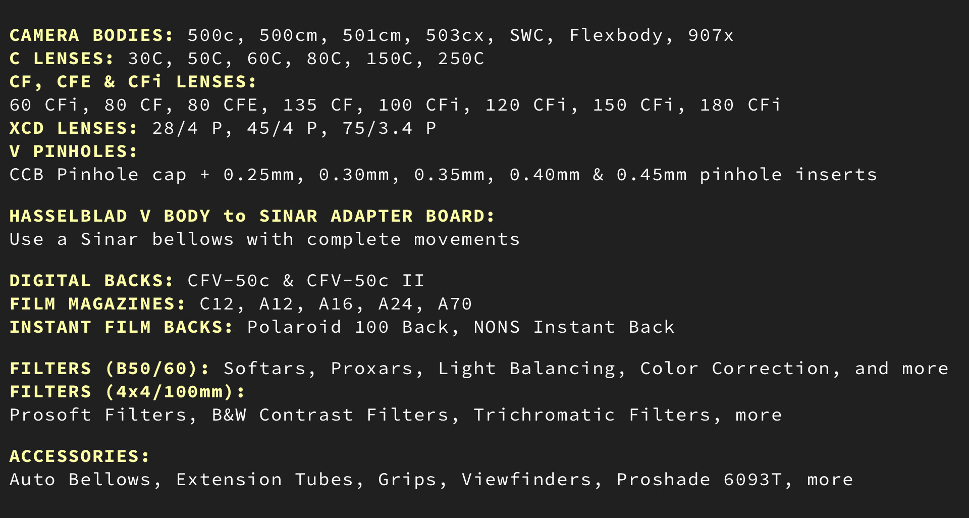 Below is a list of Hasselblad cameras and accessories with which I have experience. I can be contacted regarding questions about my experience with these items.
