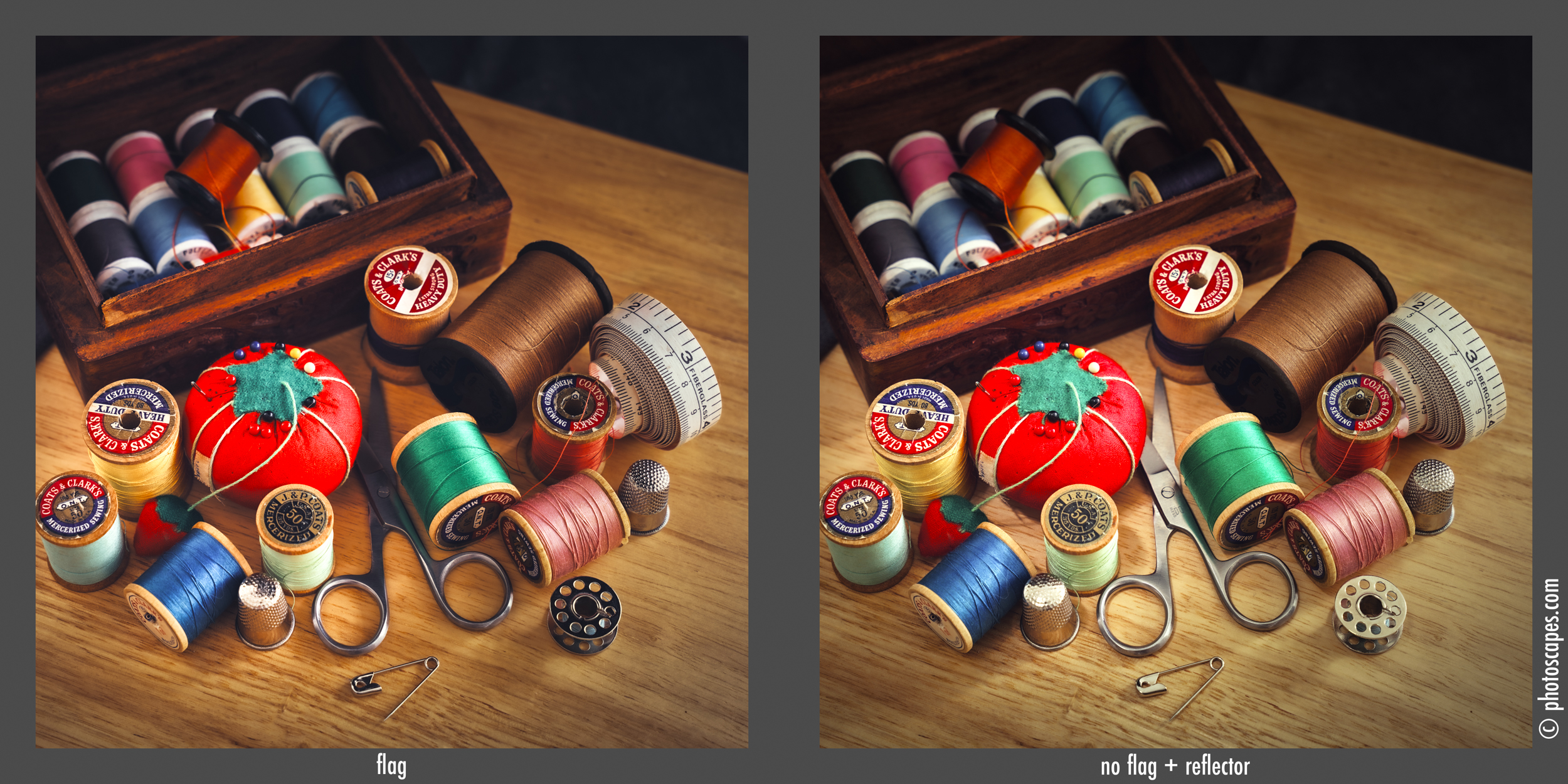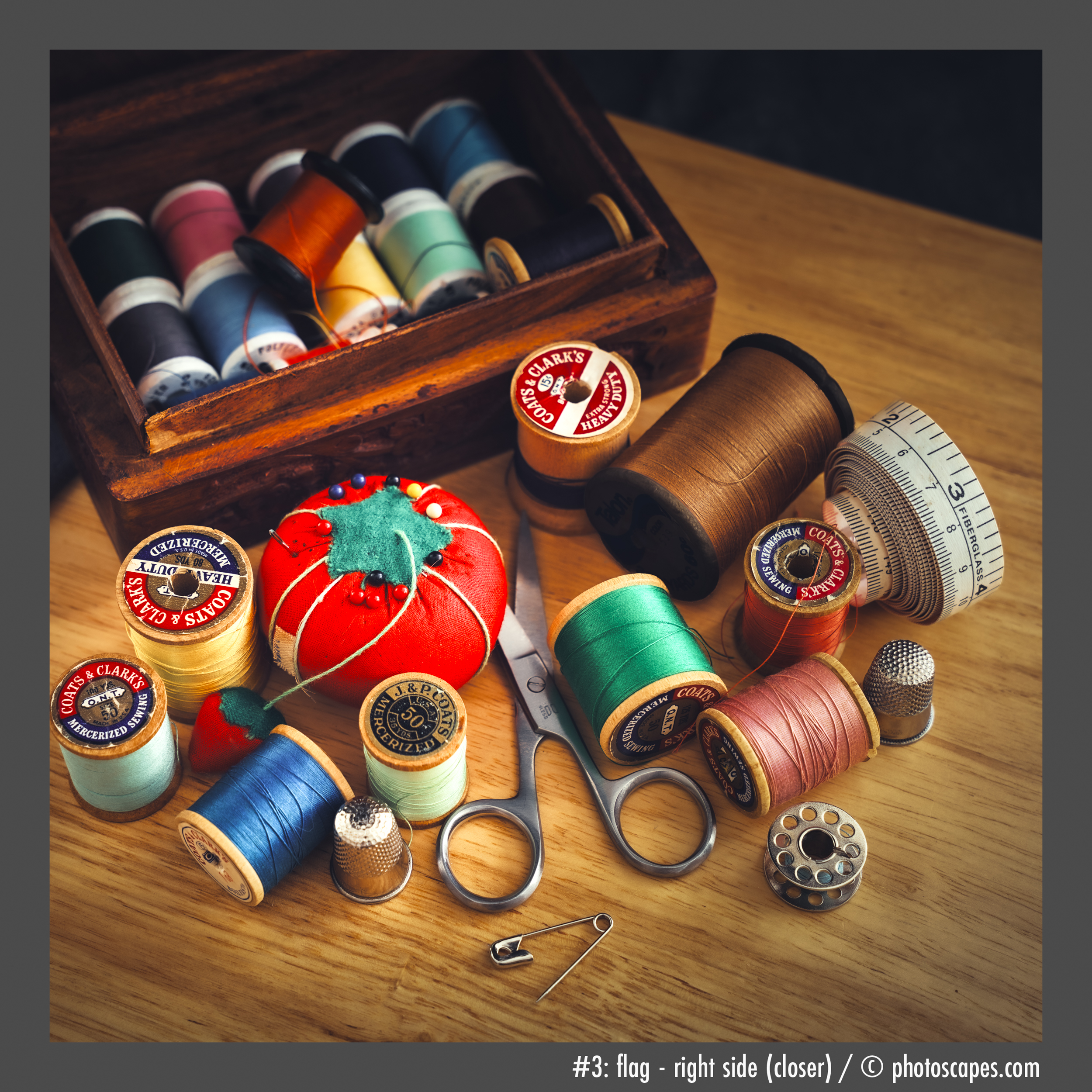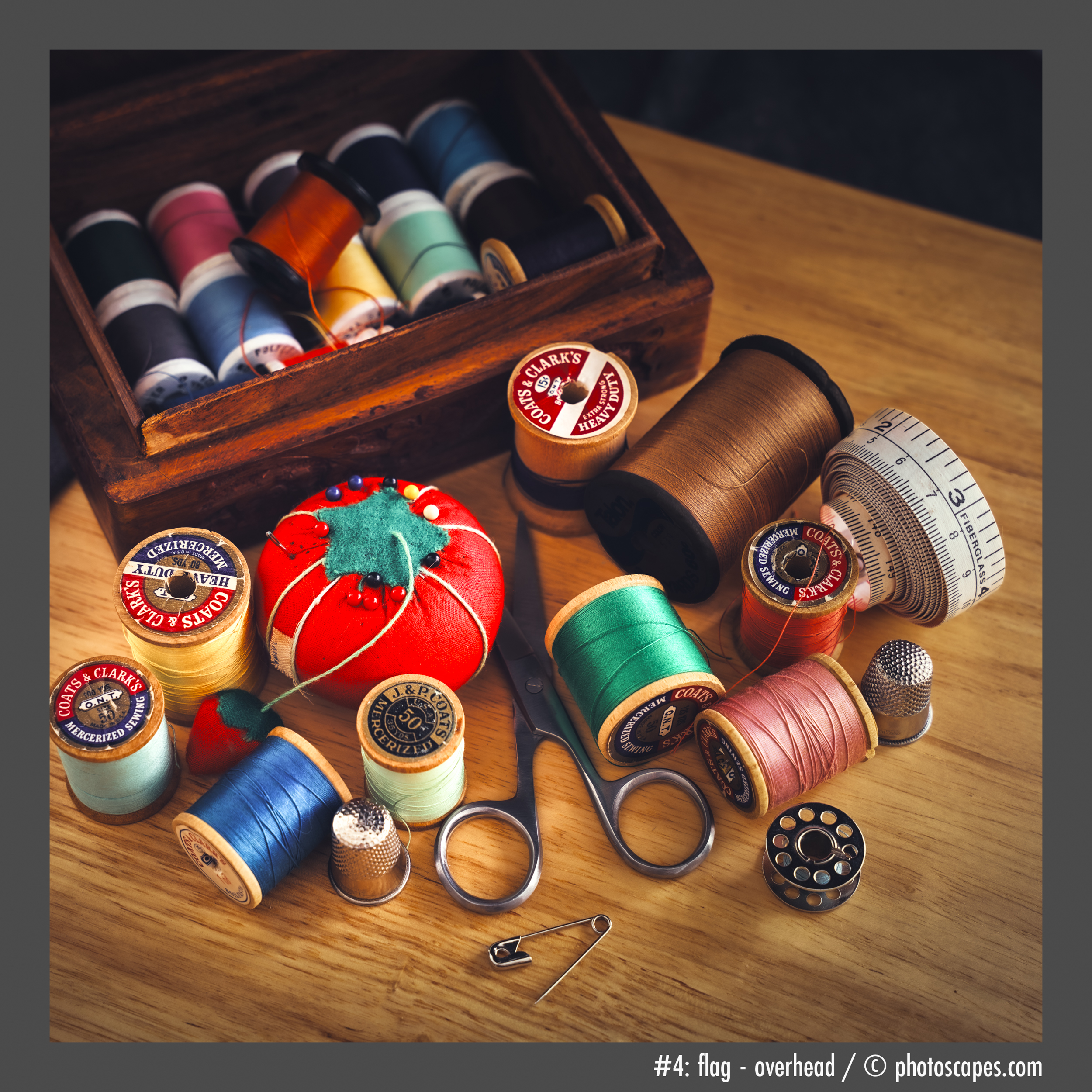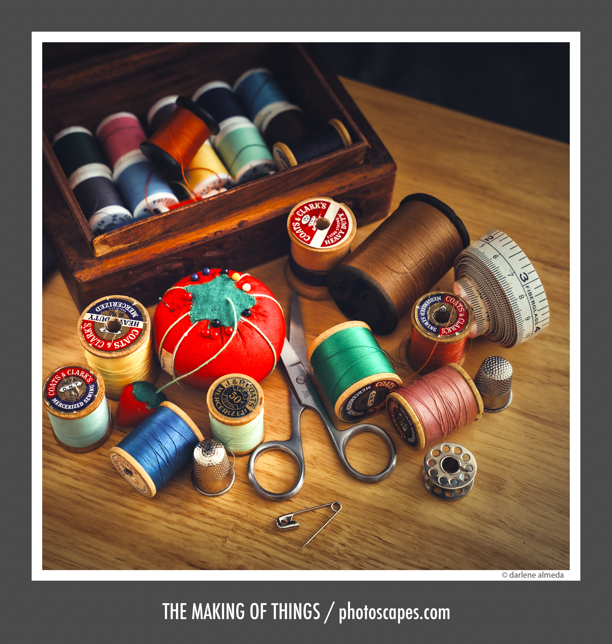 The light was soft throughout the session due to heavy cloud cover for most of the day. If you look closely at the spools of thread, the scissors, and other metal surfaces, you’ll see the flag (or reflector) quietly at work—shaping highlights and controlling reflected light.