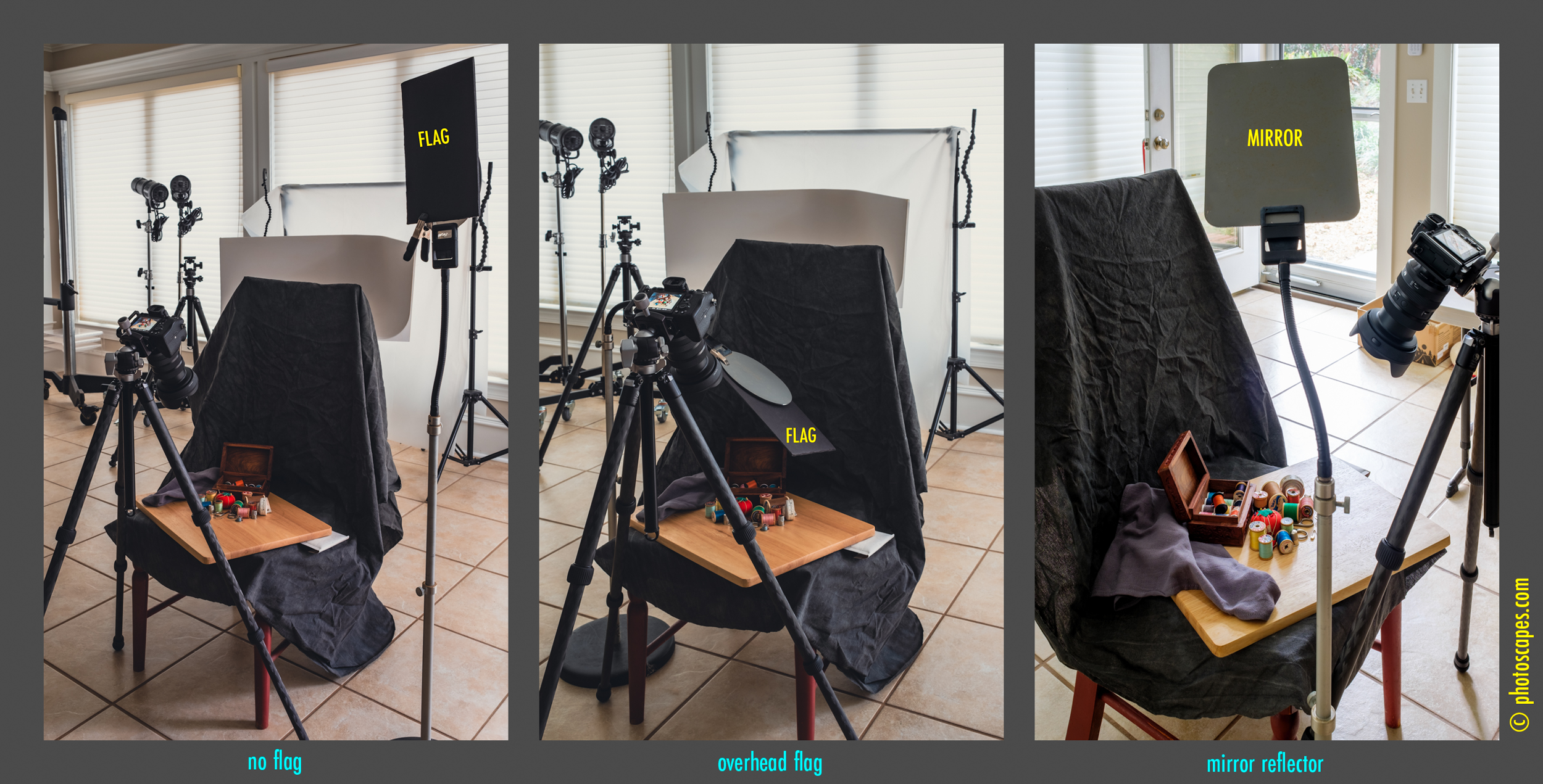 For the flag, I used an 8 × 12-inch piece of black foam core attached to a mirror stand with a clamp—simple, stable, and easy to reposition.