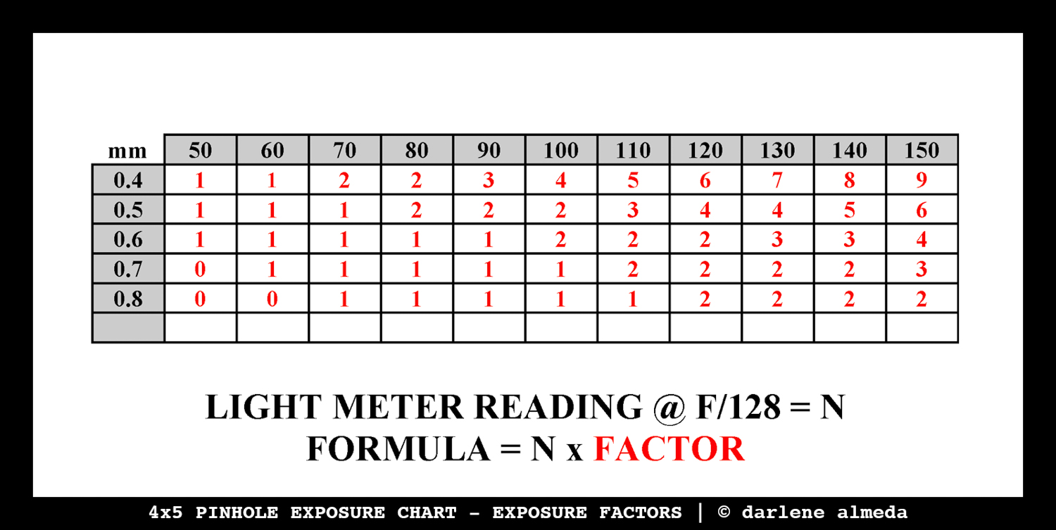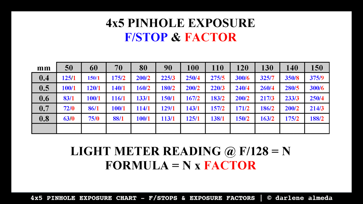 4×5 Pinhole Exposure: F/stop & Factor Chart