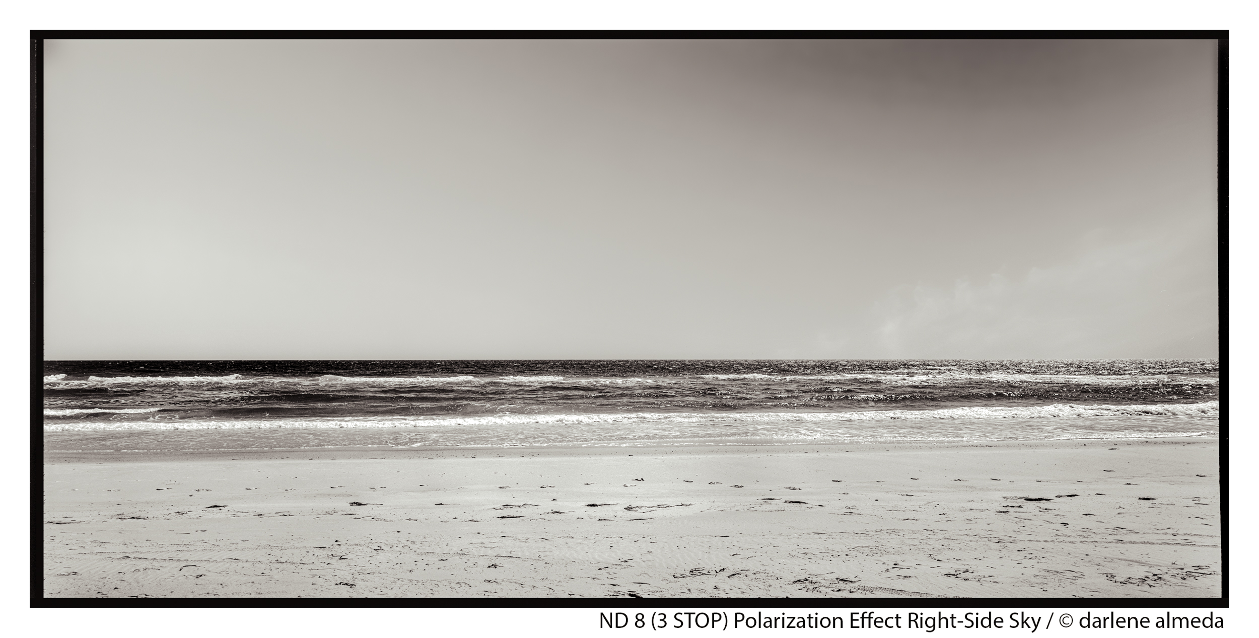 Above is an uncropped example made with the ND 8 (3-stop) filter. I used my Cambo 6×12 film magazine, so the native frame is close to 6×12, though for seascapes with generous shore, I often crop to roughly 6×17. In this frame, a noticeable polarization-like effect appears in the right-side sky. These are solid ND filters, not variable.