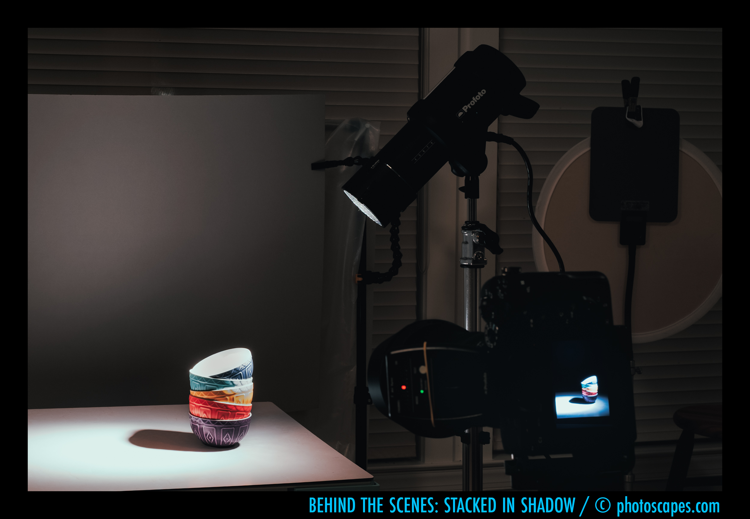 This image was made with a single light fitted with a 10° grid, placed to the right of the subject and angled downward toward the bowls.