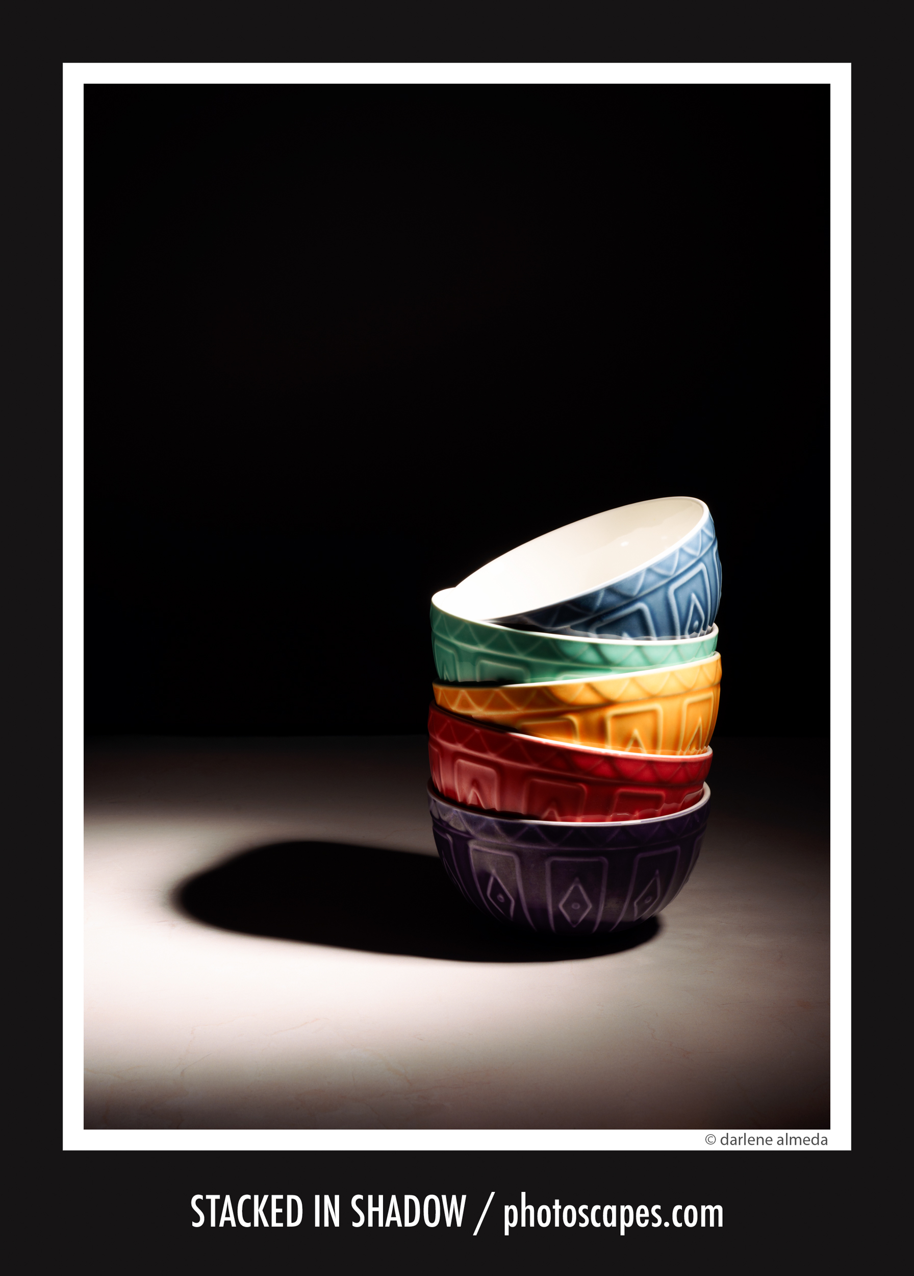 Here, the bowls are lit from camera right and slightly above. You can tell that immediately from the direction and length of the shadow, which falls leftward and slightly forward across the tabletop.