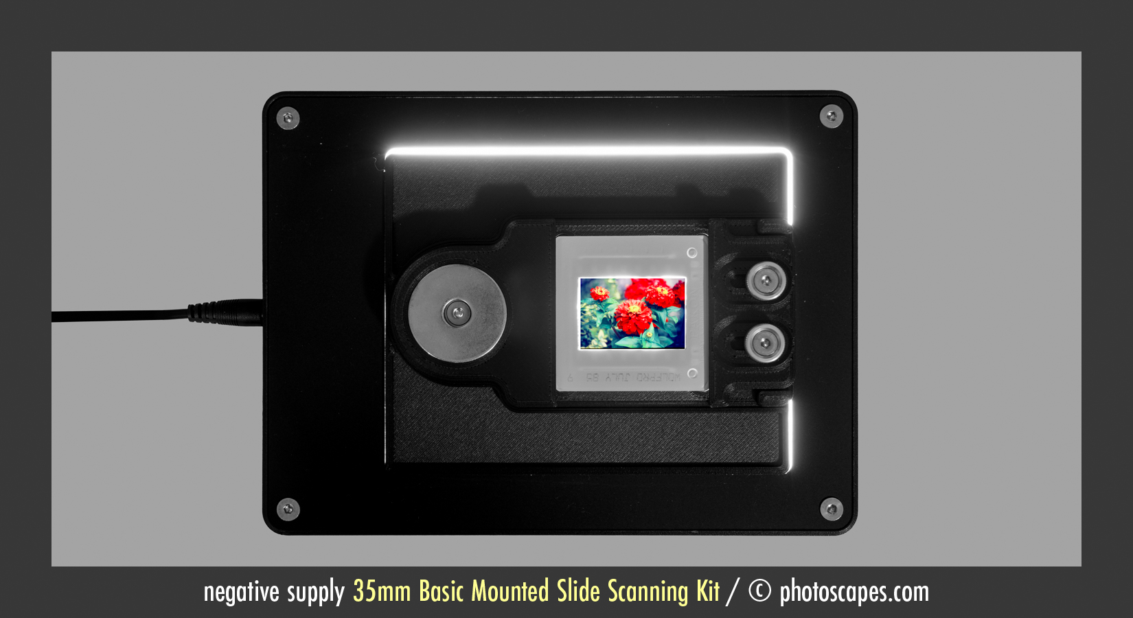 For mounted 35mm slides and negatives, the Basic Mounted Slide Scanning Kit provides a straightforward solution for positioning film during digitizing. It keeps the mounted frame properly aligned with the light source and camera while allowing quick changes between slides.