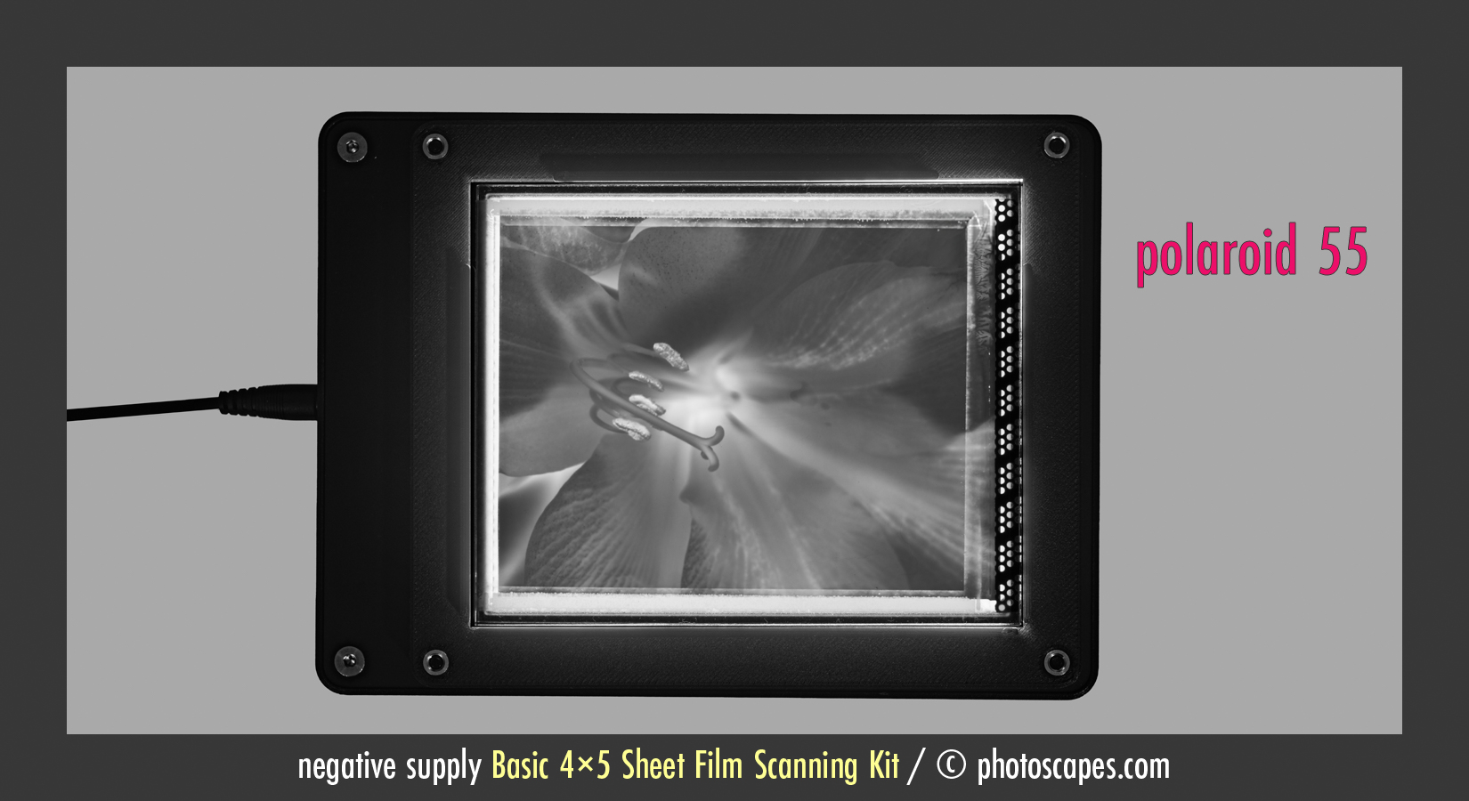 In the example shown above, I purposely used a Polaroid 55 negative from my archive to demonstrate that this setup accommodates not only standard 4×5 sheet film but also Polaroid materials.