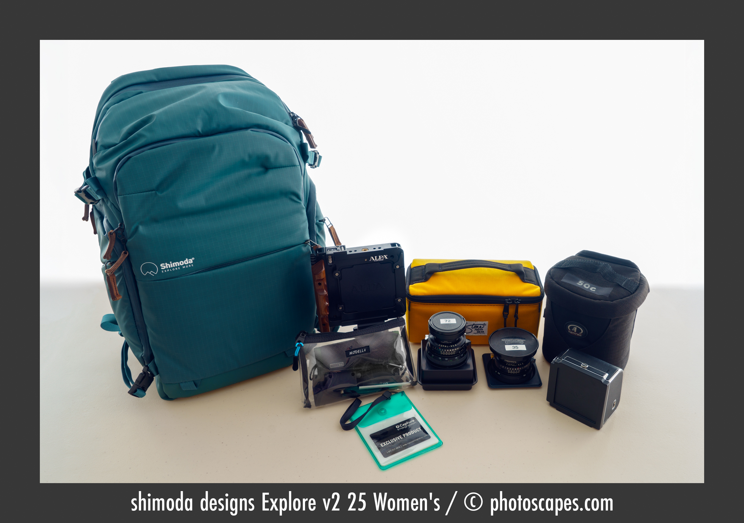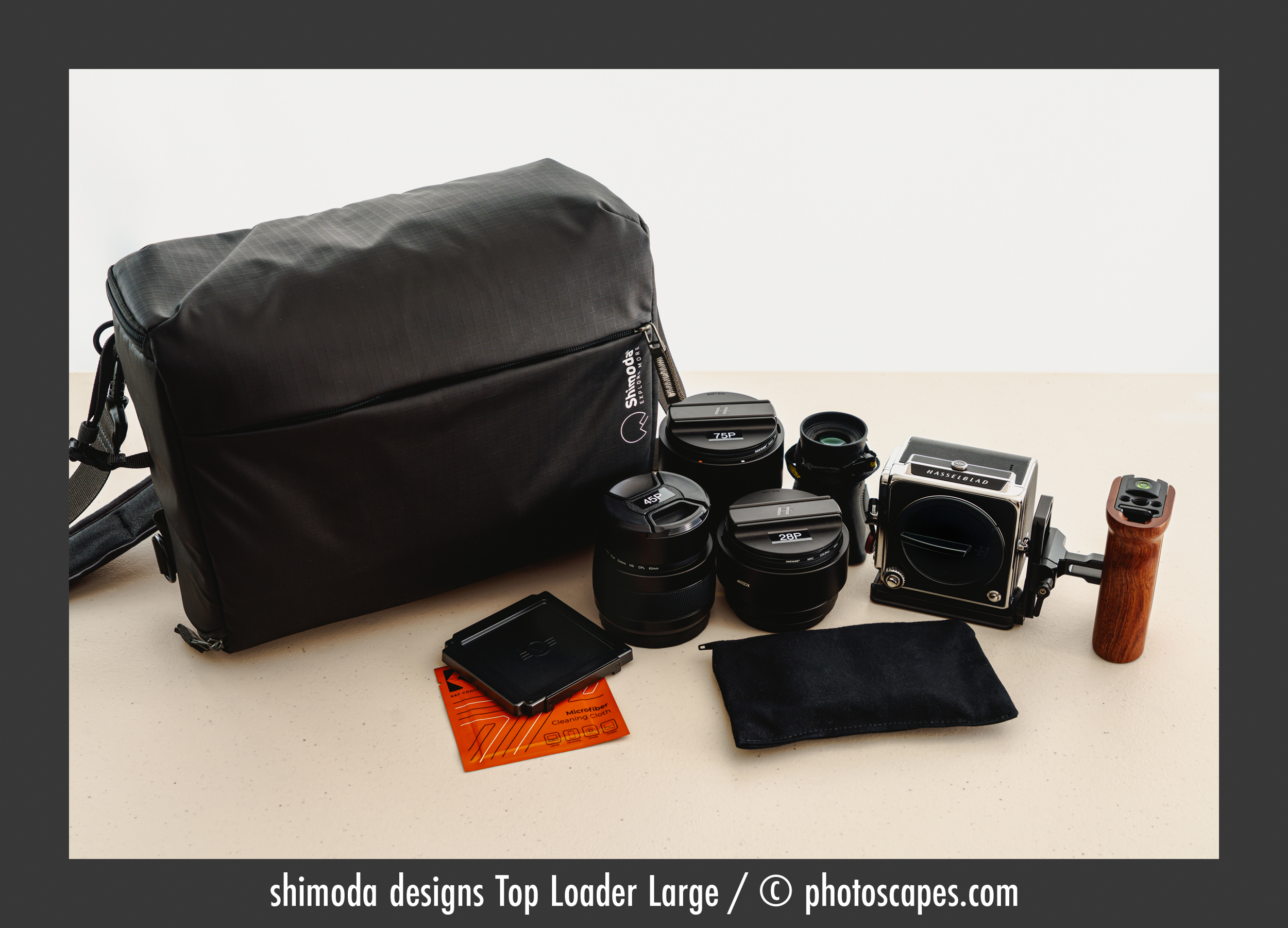 Before getting to the womenâs backpack I chose, the opening image above shows the Shimoda Top Loader (Large) and what it carries. Besides using it in the landscape, itâs also perfect when Iâm wandering small towns with my handheld 907x kit. It carries the 907x mounted on a Kirk small bracket with a SmallRig grip, along with the 28P, 45P, and 75P lenses, three batteries, a Peak strap, and a Hoodman loupe. The camera grip is broken down when stored in the bag.