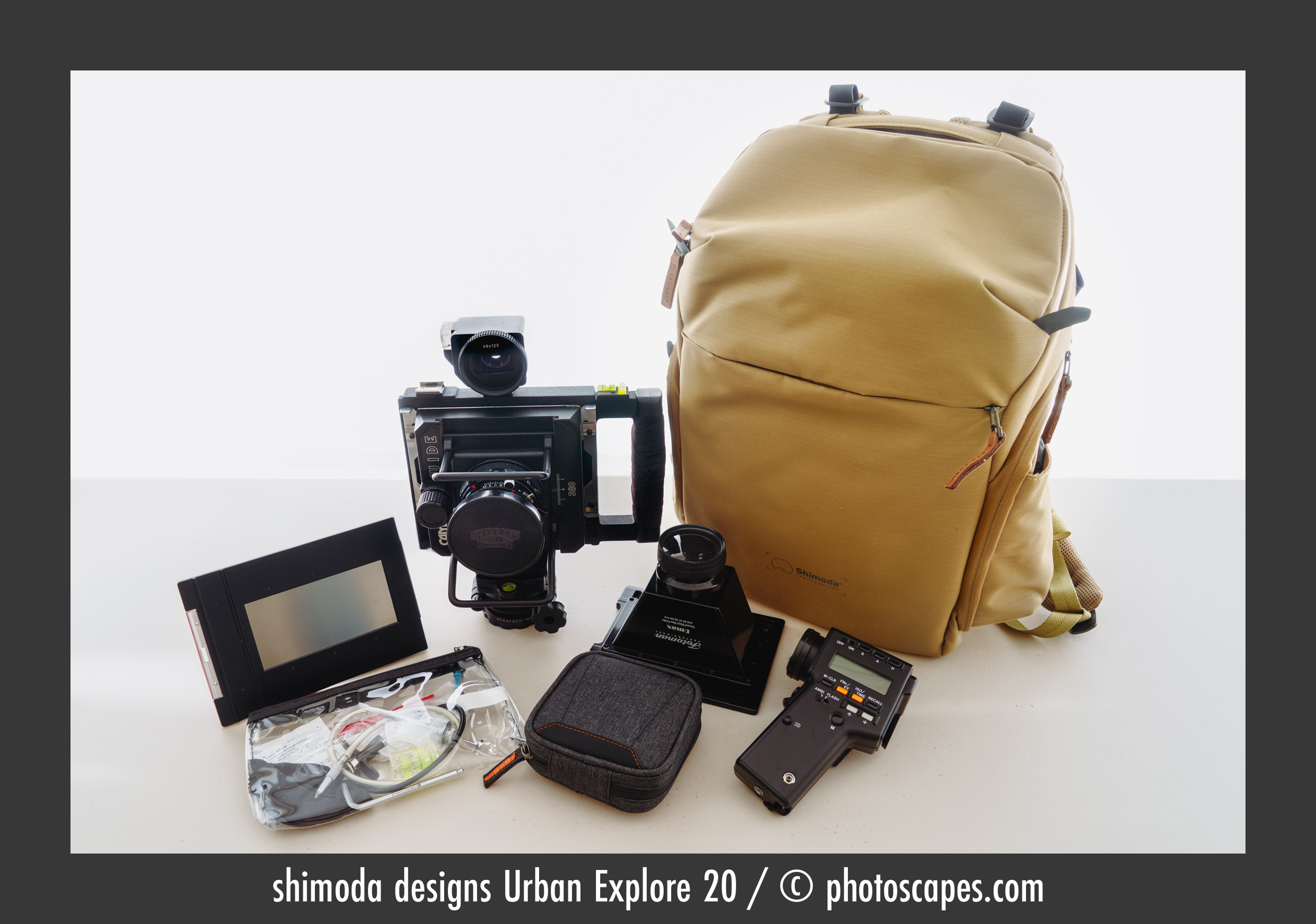 The second Shimoda backpack I added was the Urban Explorer 20L, which I mainly use when exploring with my scooter. It comfortably holds my Hasselblad 501cm four lens film kit or a favorite 4Ă5/6Ă12 film kitâthe Cambo Wide 580 and its accessories.