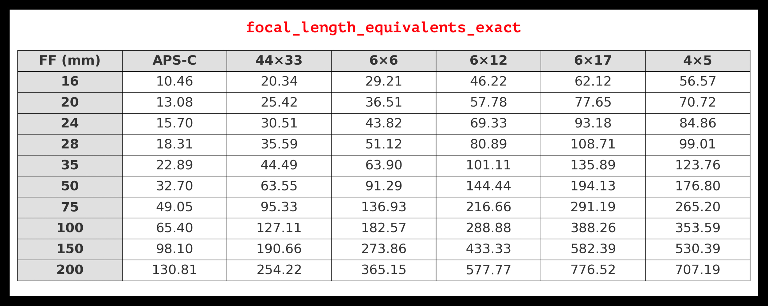 Below is an exact equivalent chart for all the camera formats I shoot. It is easy to see why rounding off to the nearest available lens equivalent is a good idea.